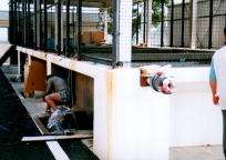 | 市場の前には、本格的なイケスがあり活魚が管理されています。今、漁師さんが、水の調整中の絵です。 |